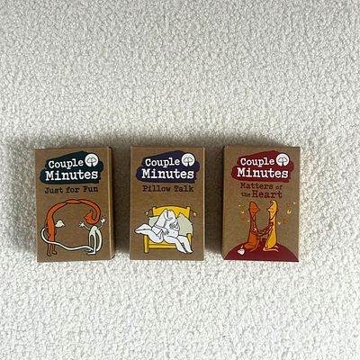 What a gem! My husband and I have tried other conversation starters over the years but CoupleMinutes is the only set we pick up again and again. The questions are light-hearted and much more fun and interactive than the usual question/answer formats. The illustrations are super-cute, too. The little boxes are the perfect size to slip into my handbag, so we often get them out at the restaurant to really focus on just us. No more checking phones on date-nights now – bonus!